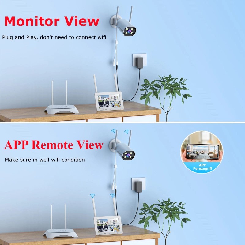 2-Way Audio & Remote Control - Use the security camera system wireless outdoor‘s live view and two-way audio to see, hear and speak to family and pets in your home through your smartphone or monitor. It as a baby monitor is also a good choice, when you are at home can be viewed at any time through the portable monitor, and when you are out for work can also be remotely real-time viewed through the APP.
