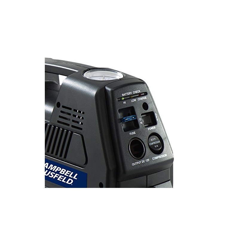 The Campbell Hausfeld rechargeable cordless inflator (CC2300) delivers up to 230/250 PSI of inflation power and also serves as a portable, rechargeable, 12-volt power supply. Can be used on most bicycle, automotive and recreational tires, as well as air mattresses, rafts, sports ball, sports equipment and more. It’s convenient, built-in power supply can operate or charge many 12-volt devices, helping to keep your essential electronics up and running wherever you go. Includes two inflator nozzles and one sports ball needle.Finish your projects faster and easier with Campbell Hausfeld.