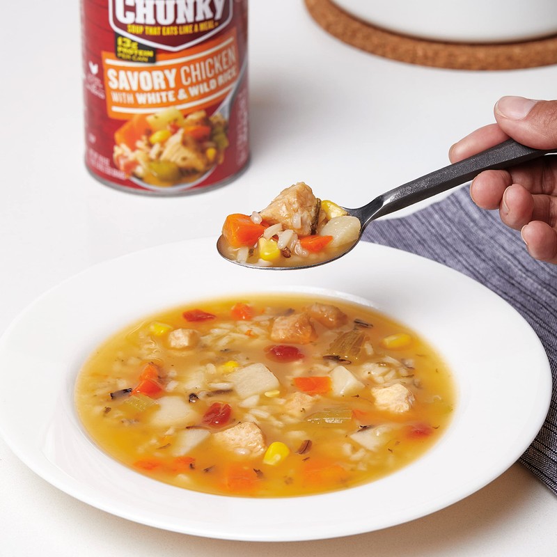 - Campbell's Chunky Soup: Twelve (12) 18.8 oz cans of Campbell’s Chunky Savory Chicken with White and Wild Rice Soup