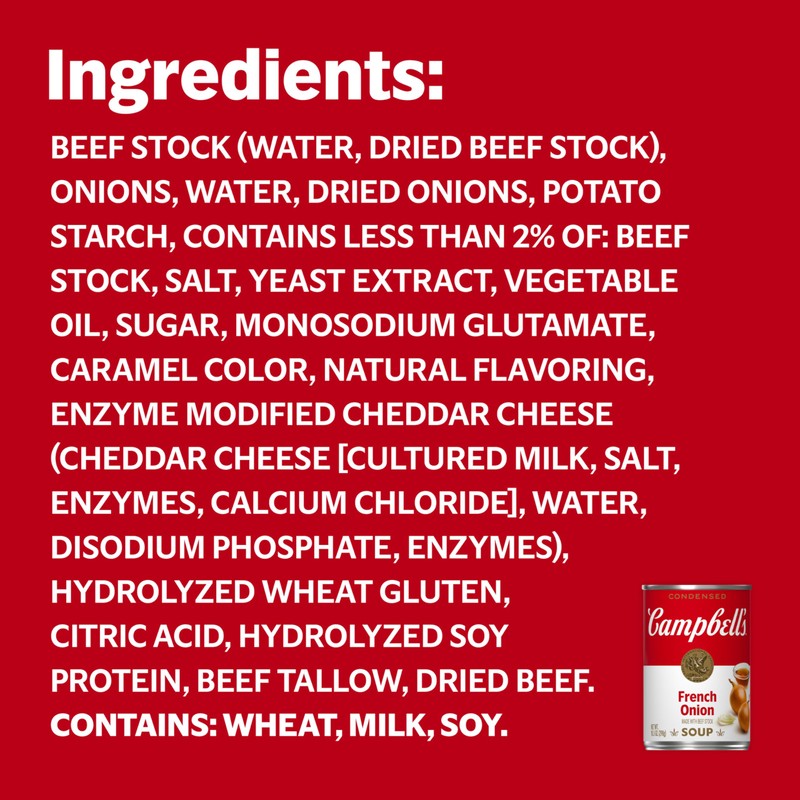Campbell’s Condensed soups—Made for Real, Real Life. From Chicken Noodle to Tomato and everything in between, we make delicious soups with quality, farm- grown ingredients in flavors you and your family know and love. Whether Campbell’s Condensed soups are your secret ingredient in recipes or you want to simmer down with the perfect bowl, we have a soup for everyday that everyone can enjoy. When you grab the familiar red and white can, know you’re grabbing a trustworthy brand that lacks artificial flavors and colors. Campbell's Condensed French Onion Soup is our rich combination of quality beef stock bursting with melt-in-your-mouth onions. Dress it up in diverse recipes like French Onion Sliders, French Onion Dip or French Onion Turkey Casserole. For ideas, visit CampbellsKitchen.com.