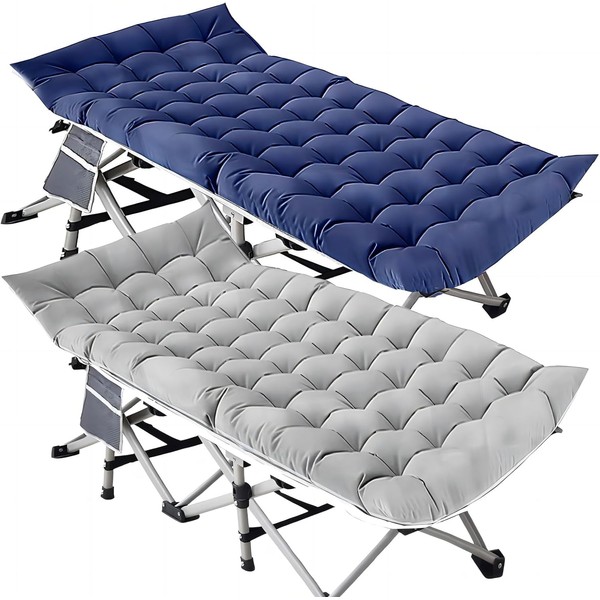 Camping Cot, Folding Camping Cot for Adults, Folding Bed, Heavy Duty Sleeping Cots with Carry Bag, Double Layer Oxford Portable Sleeping Bed 600LBS(Max Load) (Silver Frame Blue Pad&GrayPad, 2Pack)