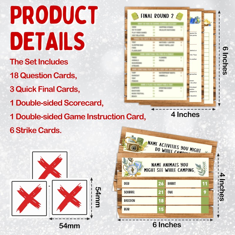 - Package Content: Our friendly feud cards include 18 friendly feud question cards, 3 fast final rounds cards, 1 double-sided scorecard, 1 double-sided instructions card and 6 strike cards, for a total of 29 cards.
