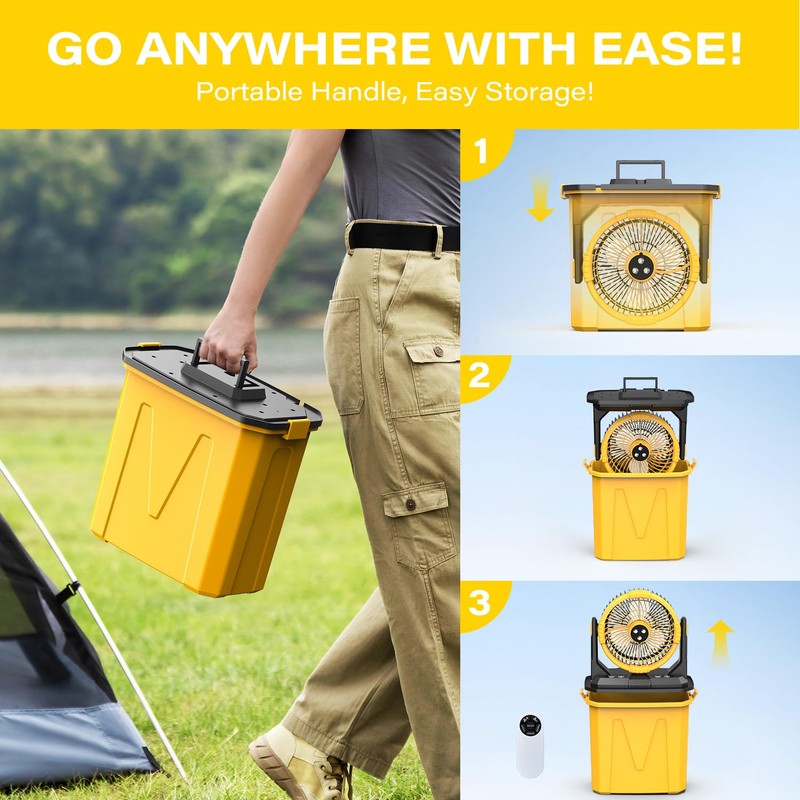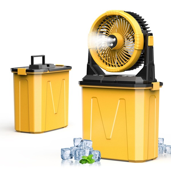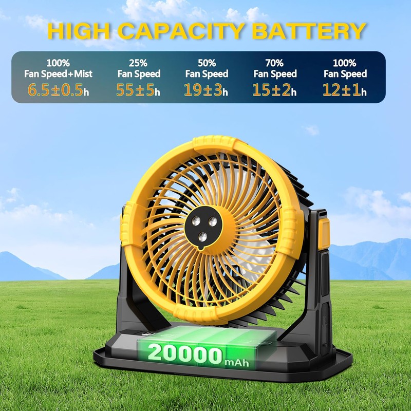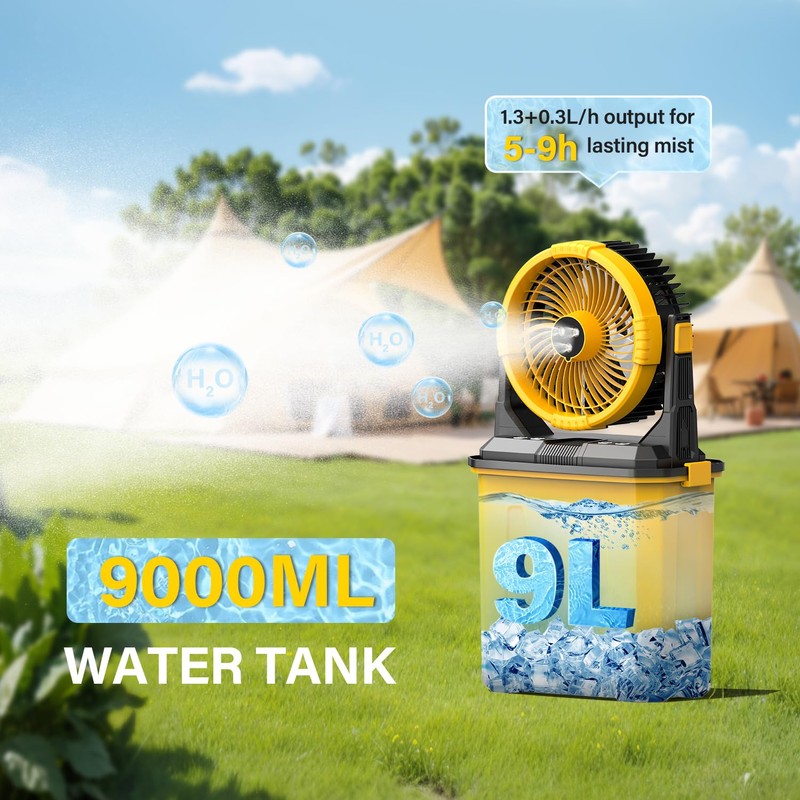 CCGIRU Camping Misting Fan with LED Lantern, 20000mAh Rechargeable Battery Operated Fan with 3 Large Spray Outlets & Hanging Hook, 4 Speeds,Remote Control for Camping, Fishing,Travel-Yellow