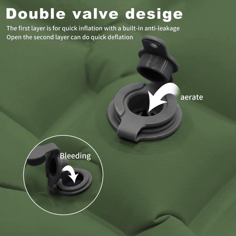 Dual-layer valve: There are two layers of valves in the camping air mattress, the first layer of valves is a one-way inflatable system containing anti-leakage, and the second layer can be opened for quick deflation.