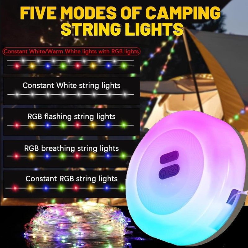 • Compact & Versatile: The camping string lights is 8.04oz lightweight, easy to carry and storage. A versatile light for camping, hiking, fishing, repairing, power outages, hurricanes, and emergency. A decor fairy lights to add elegance and color to your garden, pathway, walkway, patio, porch, tree, balcony.