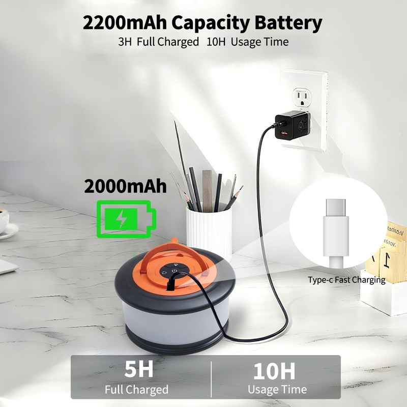 - 【Long-lasting battery life, Type-C Cable included】Built-in 2200mAh large-capacity battery, a single charge in 3 hours can provide 3.5 to 10 hours of ultra-long lighting, depending on the mode. Supports Type-C fast charging, and can still be used normally while charging. This camp light/light string combination allows you to have light protection outdoors at any time, making your camping trip worry-free and convenient.