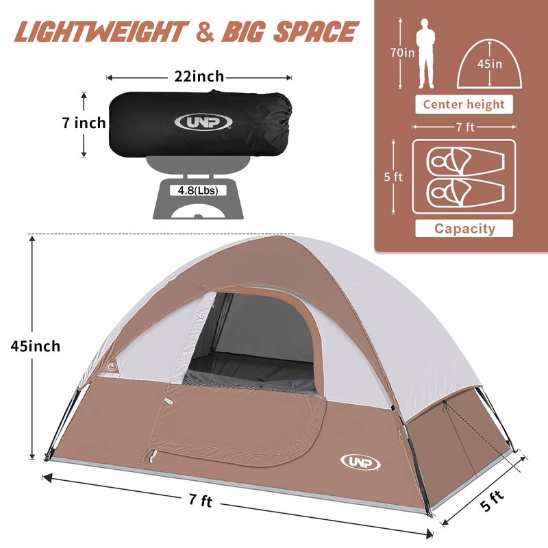 - Lightweight & Big Space: 7'L x 5' x 45"H. Spacious room for 2 adults.Standard size fits 1 full air mattress.And this 2 Person tent weighs just 4.8lb,it's very easy to carry.This tent perfect for outdoor camping, hiking,climbing,a indoor or backyard play tent, fishing, or shelter at the beach in all weather.