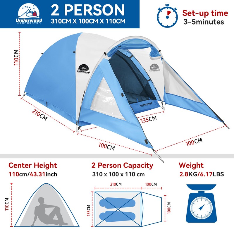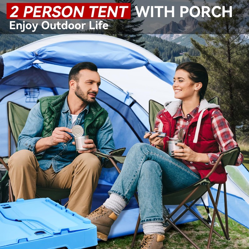 - 【SPACIOUS INTERIOR SPACE】 Designed with an interior of 10.17 x 4.43 x 3.61 ft (310 x 135 x 110 cm), this 2 person tent offers a cozy and roomy space for two adults. The vestibule of the two person tent provides extra storage space for wet gear, boots, or backpacks while keeping the main sleeping area dry and neat. This 2 man tent easily fits 2 sleeping bags or 1 queen air mattress, making it ideal for couples, friends, or solo travelers (Note: Tent size includes vestibule dimensions)