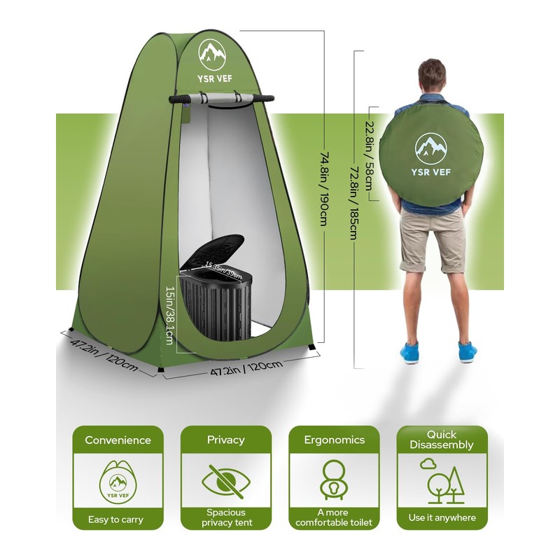 - The YSR VEF All-In-One Portable Toilet Kit is the most valuable toilet kit on the market. It can be used for all outdoor adventures, including camping, fishing, beach trips, hiking, and travel. We strive to provide the most convenient products so you and your family can continue to enjoy an adventurous life.