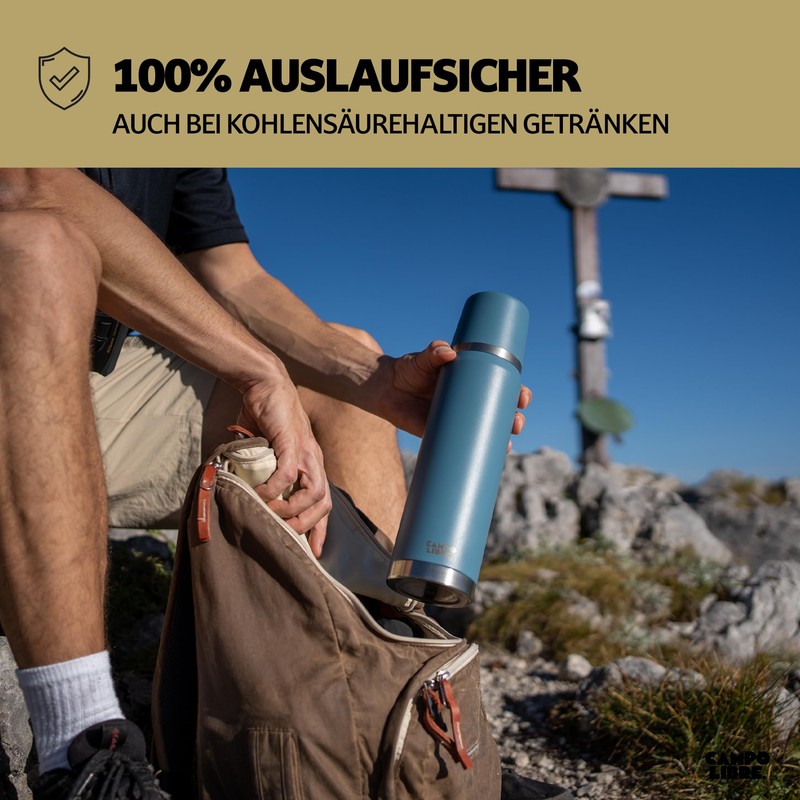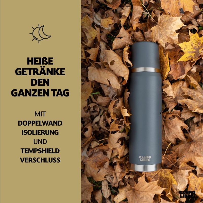 - Campo Libre quality: Our 1 litre thermos flask is made of high-quality 18/8 stainless steel and is 100% leak-proof. The self-developed coating of the thermal jug is extremely durable and built to last. In addition, our Thermos has a double-walled thermal mug, which is disguised as a lid.