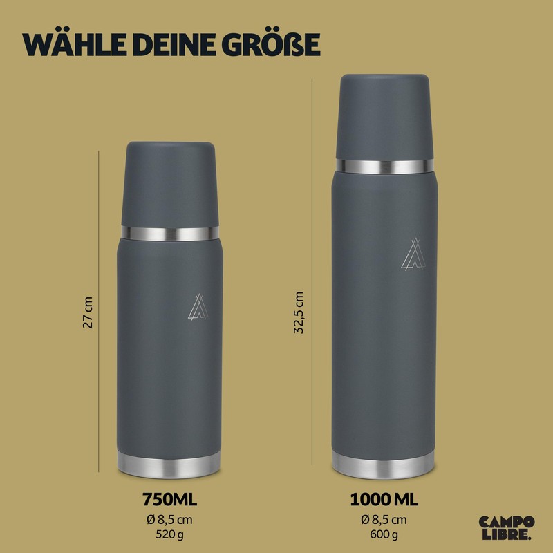 Campo Libre. Jaco® I Thermos Flask 1 Litre & 750 ml I Thermos with Cup I Our Thermos Flask Keeps Hot for at least 24 Hours I Insulated Jug with High-Quality Double Wall Insulation is 100% Leak-Proof