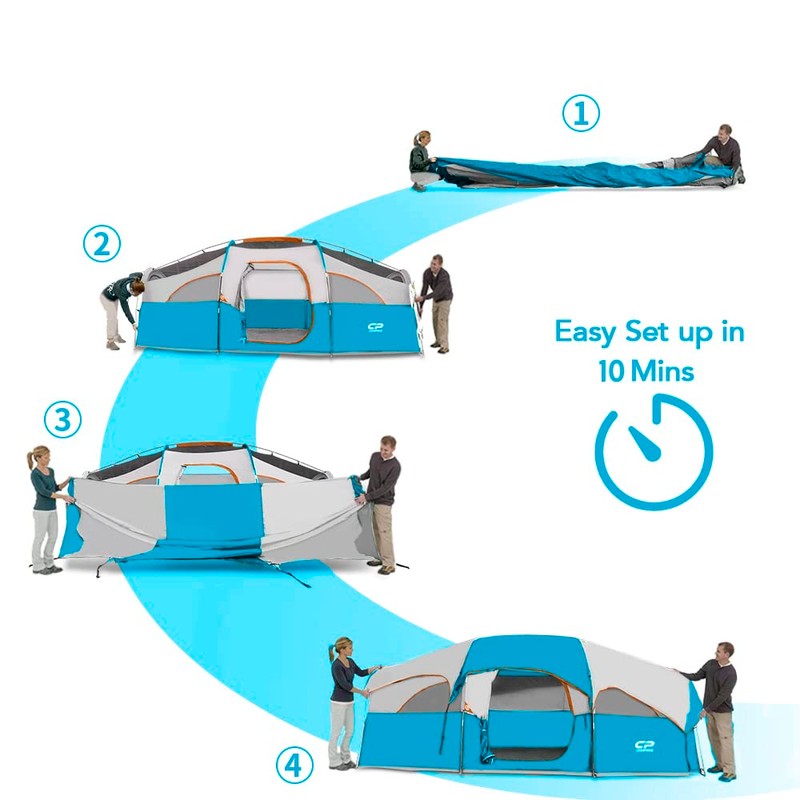CAMPROS Tent-8-Person-Camping-Tents, Waterproof Windproof Family Tent, 5 Large Mesh Windows, Double Layer, Divided Curtain for Separated Room, Portable with Carry Bag - Sky Blue