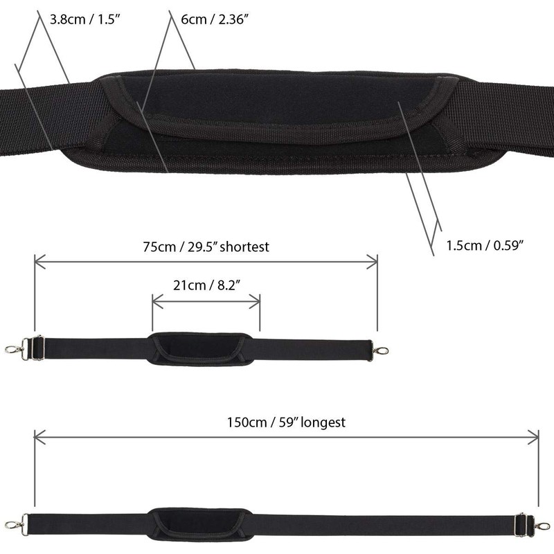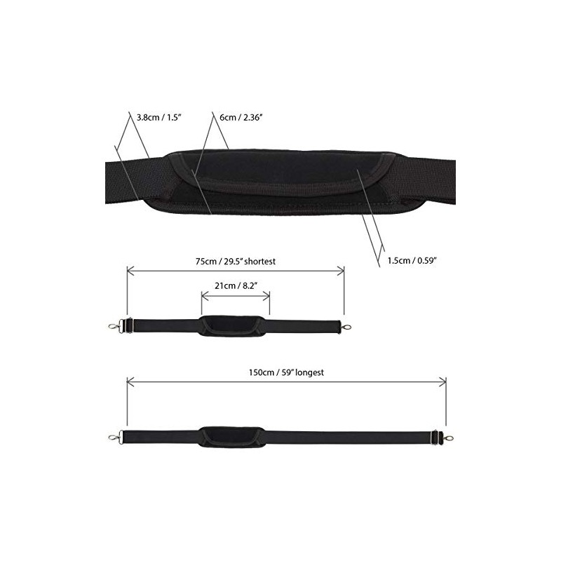 - Carrying strap replacement dimensions: length 150 cm, width 3.8 cm, thickness 1 mm. Pad size: length 21cm, width 6cm, thickness 0.75cm.
