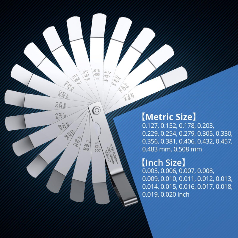 - 【16 BLADES MEASURING RANGE】 Metric sizes (mm):0.127, 0.152, 0.178, 0.203, 0.229, 0.254, 0.279, 0.305, 0.330, 0.356, 0.381, 0.406, 0.432, 0.457, 0.483, 0.508mm; Standard SAE(inch sizes): 0.020, 0.005, 0.006, 0.007, 0.008, 0.009, 0.010, 0.011, 0.012, 0.013, 0.014, 0.015, 0.016, 0.017, 0.018, and 0.019 inches