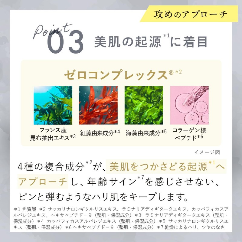 - (Origin to give skin firmness *1) Duplication (Zero Complex *2): "Zero Complex" uses 4 different ingredients, including French kelp extract, collagen-like peptide, and seaweed derived ingredients grown in extreme cold environments. It will help maintain firm skin like a pin and bouncy skin without feeling the age sign. *1 Exfoliating Layer *2 Saccarinararon Gickle Lis Extract, Laminaria Di Guitar Extract, Kappa Ficus Alvalage Extract, Hexapeptide-9 (Skin & Moisturizing Ingredient) *3 Dries to produce firmness and luster