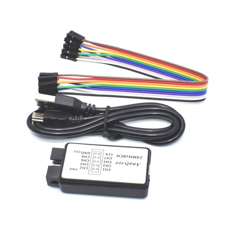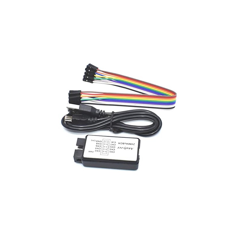 USB logic analyzer with 8 Channels and 24 Mega samples per second. Tested with PulseView and Logic2. Both tools are free to download. The input capacity is about 5pF and the impedance is 100k Ohm. USB cable and Dupont wires included. For drivers please see the websites of the software mentioned above.
