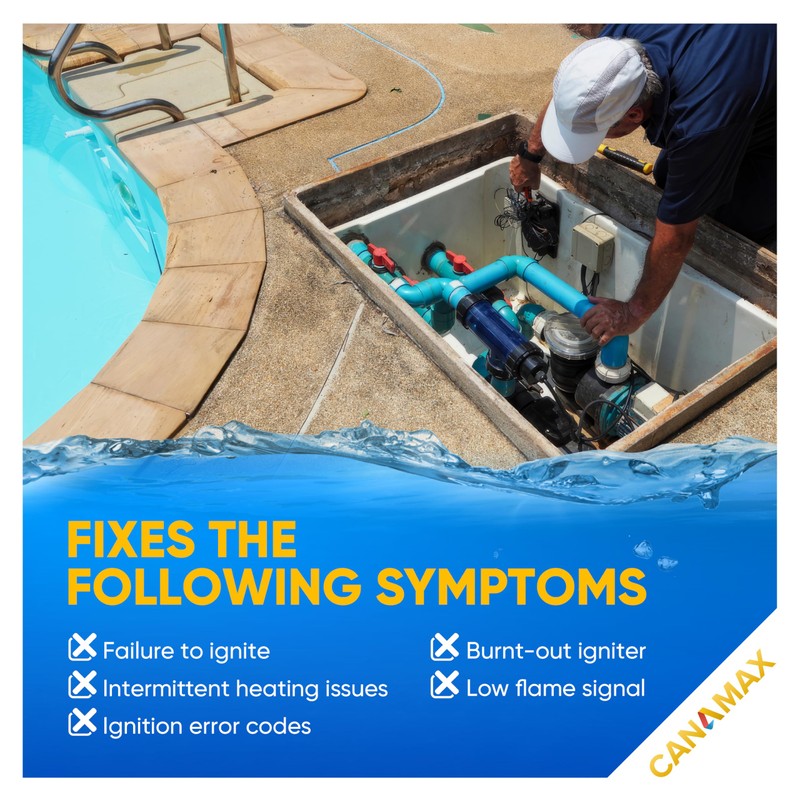 - RELIABLE POOL HEATER IGNITER REPLACEMENT: The Canamax 77707-0054 Igniter and Gasket Kit quickly solves common heating issues like slow reheating, uneven heating, and burnt smells in your pool or spa heater. Restore optimal heater performance and extend its lifespan, ensuring warm, inviting water whenever you need it.