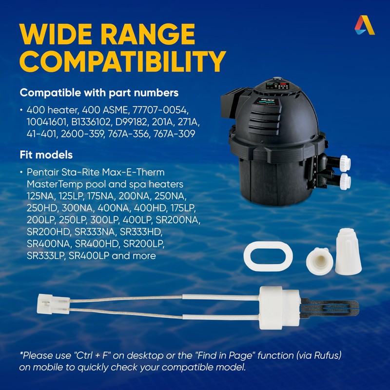 Compatible with Pentair Sta-Rite Max-E-Therm and MasterTemp pool and spa heaters, including models: 125NA, 125LP, 175NA, 200NA, 250NA, 250HD, 300NA, 400NA, 400HD, 175LP, 200LP, 250LP, 300LP, 400LP, SR200NA, SR200HD, SR333NA, SR333HD, SR400NA, SR400HD, SR200LP, SR333LP, SR400LP.