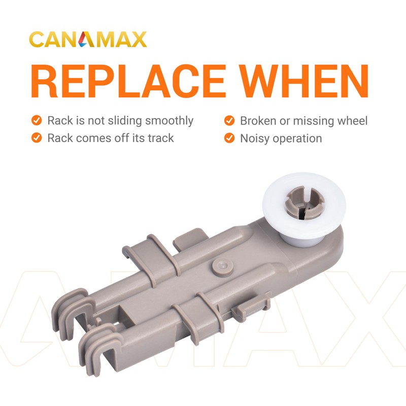 - SMOOTH SLIDING: Canamax 8268743 Dishwasher Upper Rack Wheel allows the upper rack to slide in/out of the dishwasher easily. Replace your damaged wheel to fix those symptoms: Not cleaning dishes properly | Noisy | Leaking | Door won’t close | Door latch failure | Broken/ Cracked top rack brackets/ wheels.