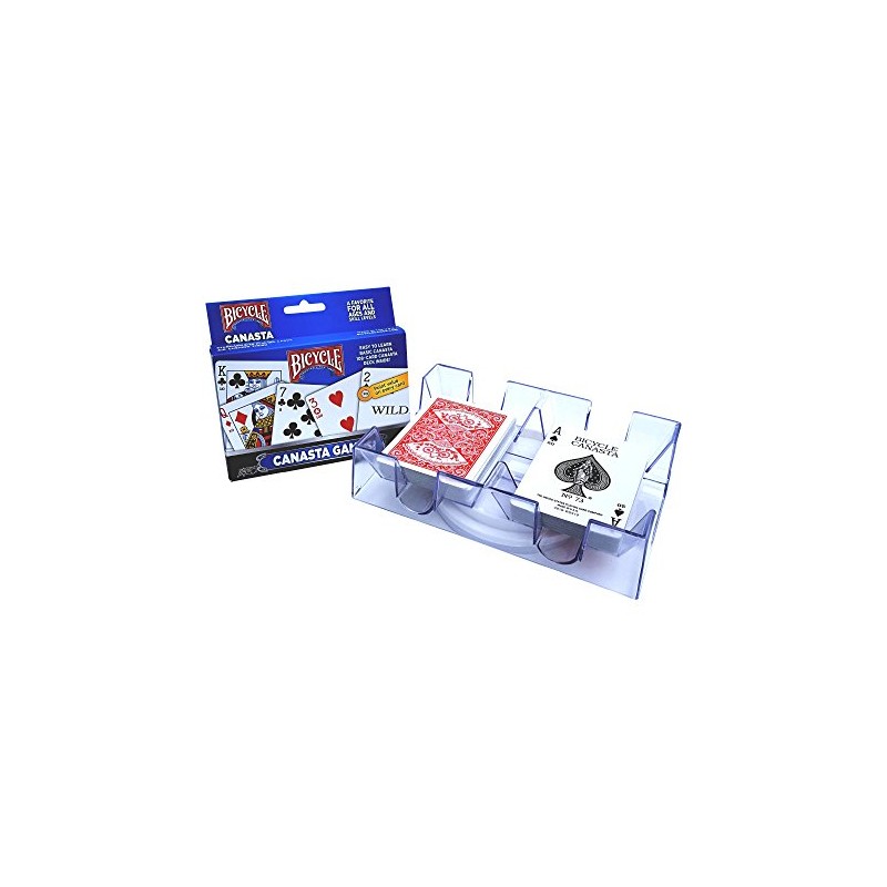 Canasta couldn’t be more fun than with this Bicycle 108-card deck of canasta playing cards with point values on every card and a CHH convenient rotating tray to keep cards in order. Each player can rotate the tray and beveled edges make for easy pick-up. Easy to learn and always a favorite, canasta is enjoyed by teens and adults at all skill levels. Cards feature Bicycle Fan Back design first introduced in 1894. Instructions included.