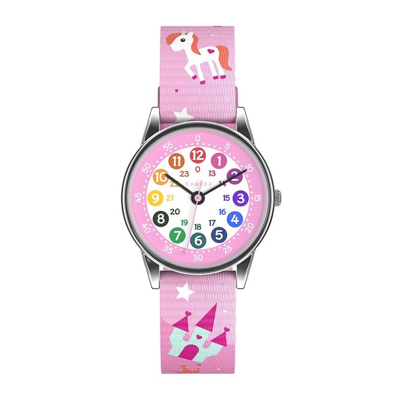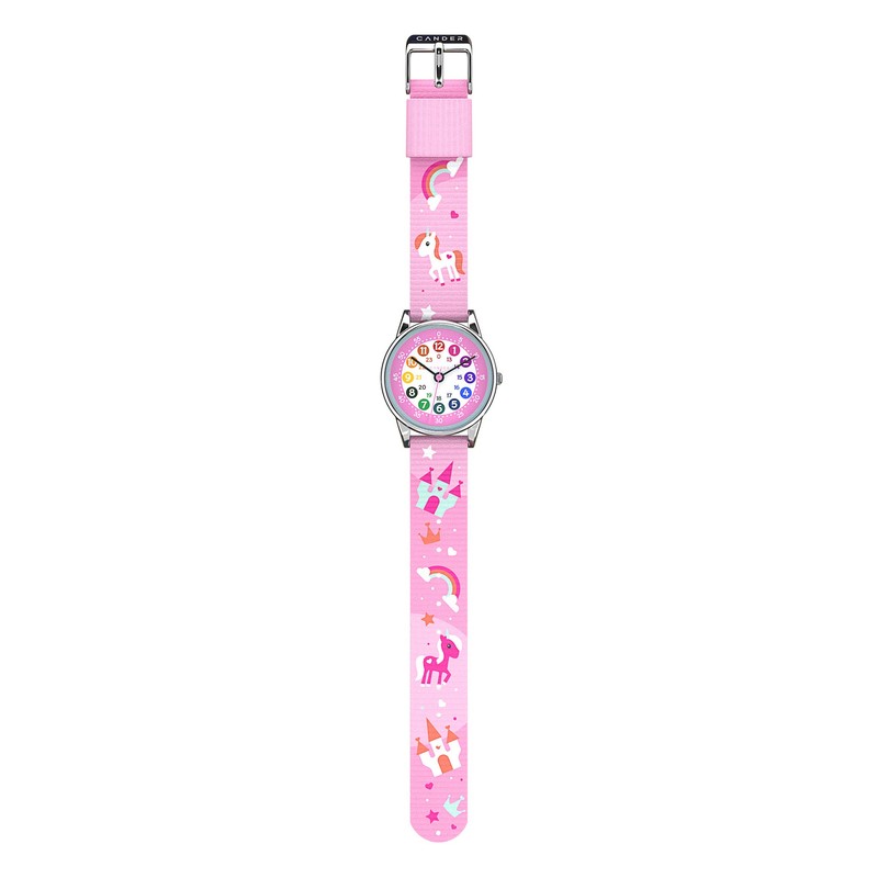 Cander Berlin MNA 1230 E Children's Watch Children's Watch Girls Watch Learning Dial Unicorn Pink Colourful, Candy pink, Round plastic bracelet with unicorn motif, learning dial
