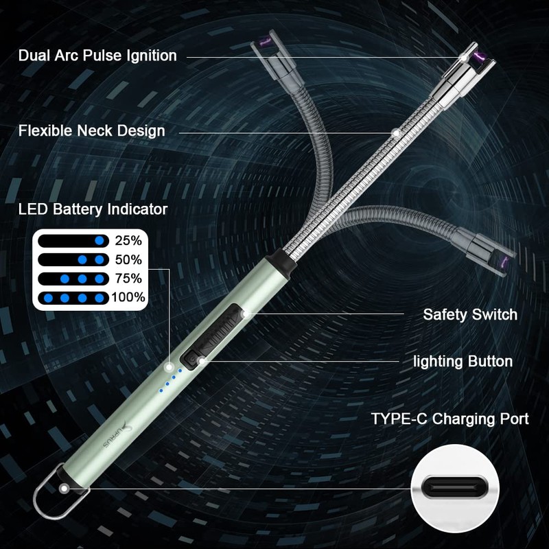 SUPRUS Electric Candle Lighter USB Type C Rechargeable Lighter Steel Shell & Hanging Hook with 360° Flexible Neck(Green)