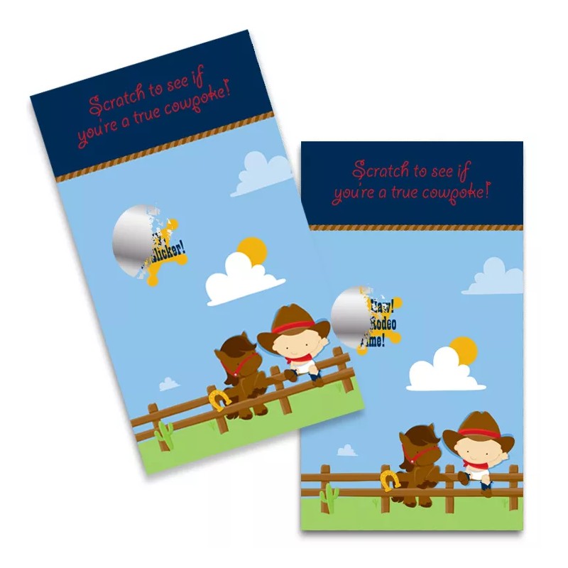 Our Scratch Off Game Pack is available in many of our most popular baby shower themes including our Little Cowboy.