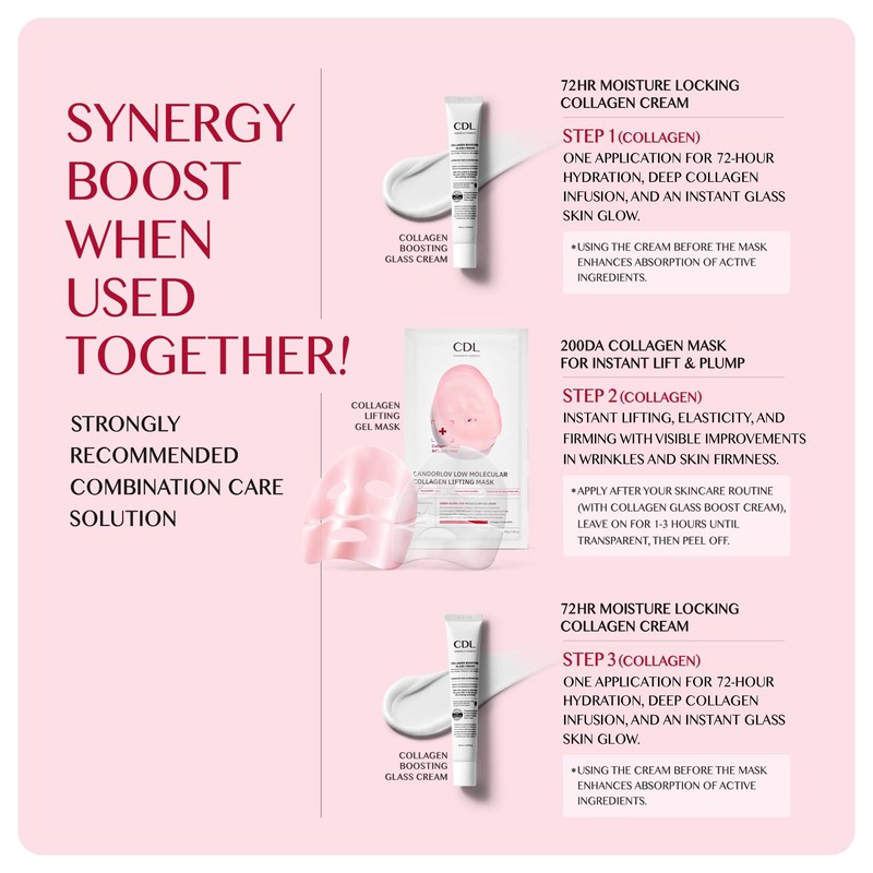 - Synergy Care with Collagen Boosting Glass Cream: The Collagen Boosting Glass Cream deeply hydrates with low molecular collagen, leaving skin smooth, plump, and dewy, while the Low Molecular Collagen Lifting Mask enhances elasticity for a firm, lifted complexion. Together, they create the perfect synergy for a youthful, radiant glow.