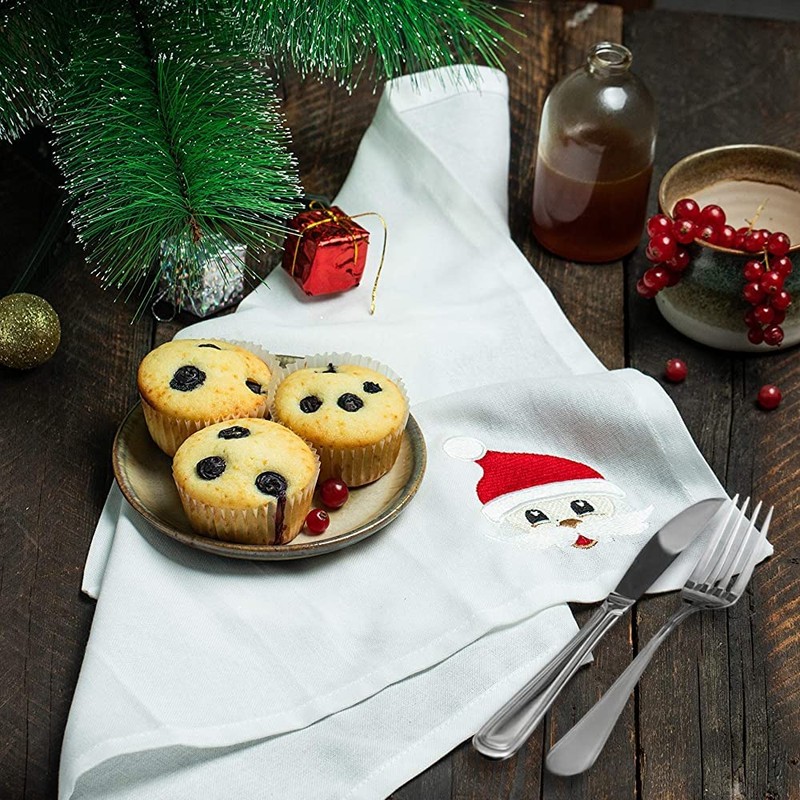 Candy Cottons Christmas Napkins Cloth Napkins Dining Table Dinner Napkins|Washable Cotton Napkins Easter Basket Decor|Happy Santa Face Embroidered 18x18 in White Pk of 6 Cocktail Party Napkins
