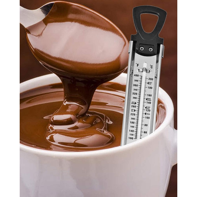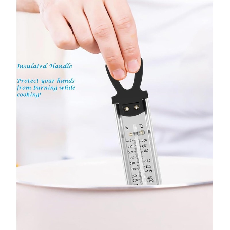 - ②WIDE TEMPERATURE RANGE:Equipped with a dual-scale display (Fahrenheit and Celsius), this thermometer covers a broad temperature range from 40°C to 200°C (100°F to 400°F), making it versatile for candy, jam, and deep-frying.