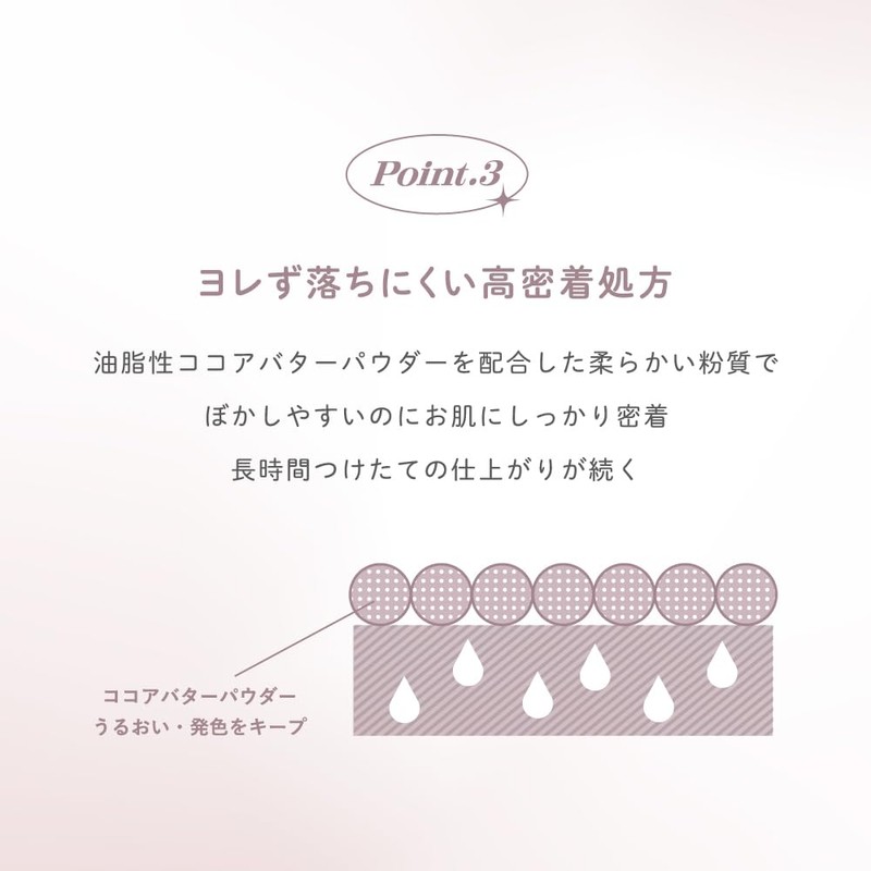 • (3) High adhesion formula that does not fall off easily: The soft powder is formulated with oily cocoa butter powder, so it is easy to blur, yet adheres firmly to the skin. Maintains a freshly worn finish for a long time