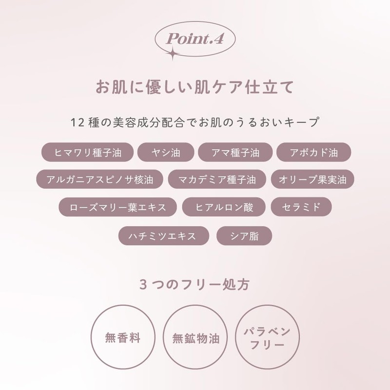 • 4. Skin Care Tailoring for Skin: Contains 12 types of beauty ingredients to keep your skin moisturized. Sunflower seed oil, palm oil, linseed oil, avocado oil, argania spinosa nuclear oil, macademia seed oil, olive fruit oil, rosemary leaf extract, hyaluronic acid, ceramide, honey extract, shea fat