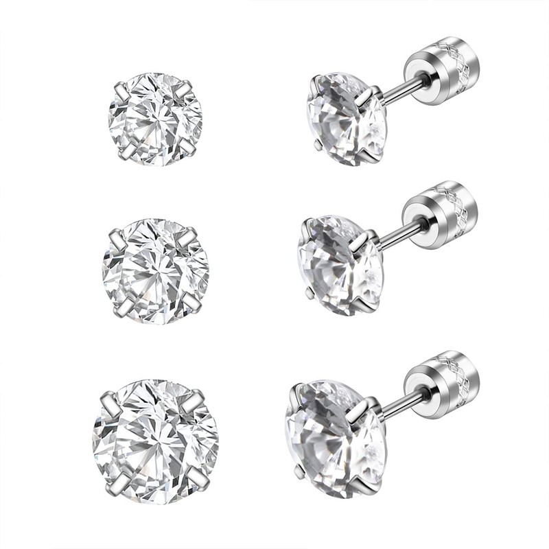 Candyfancy 3 Pairs 316L Surgical Stainless Steel Earrings Set,Size 6mm 7mm 8mm,AAA Cubic Zirconia Single Ears Stud, Simple, Transparent, Multiple Hole Earrings,Hypoallergenic