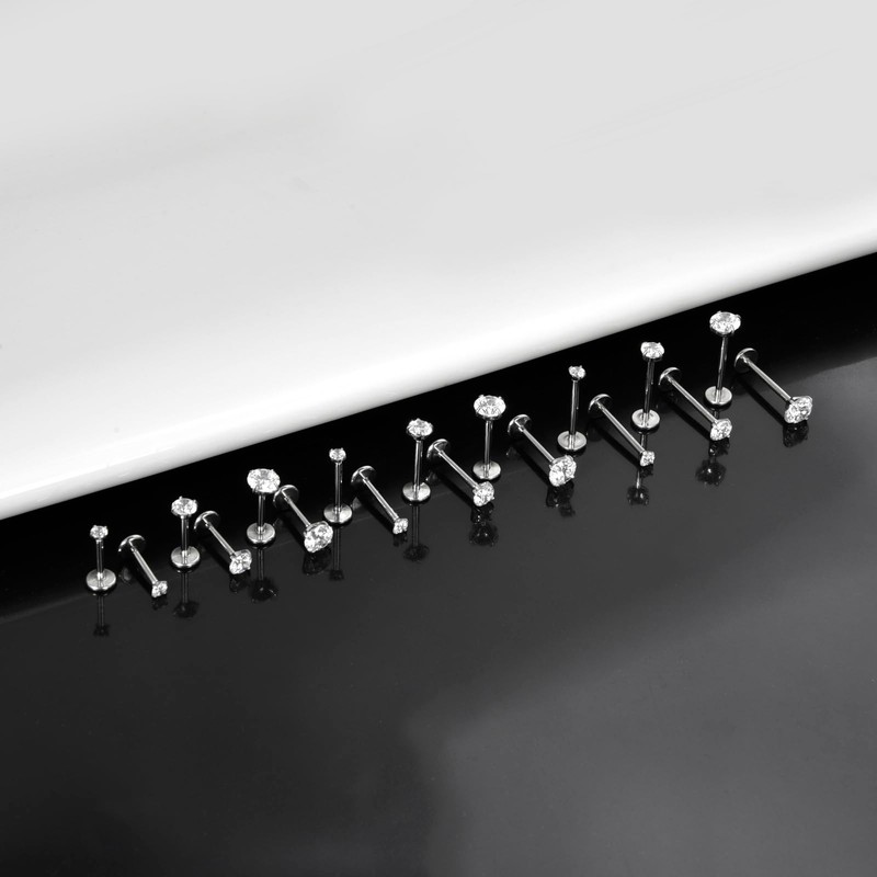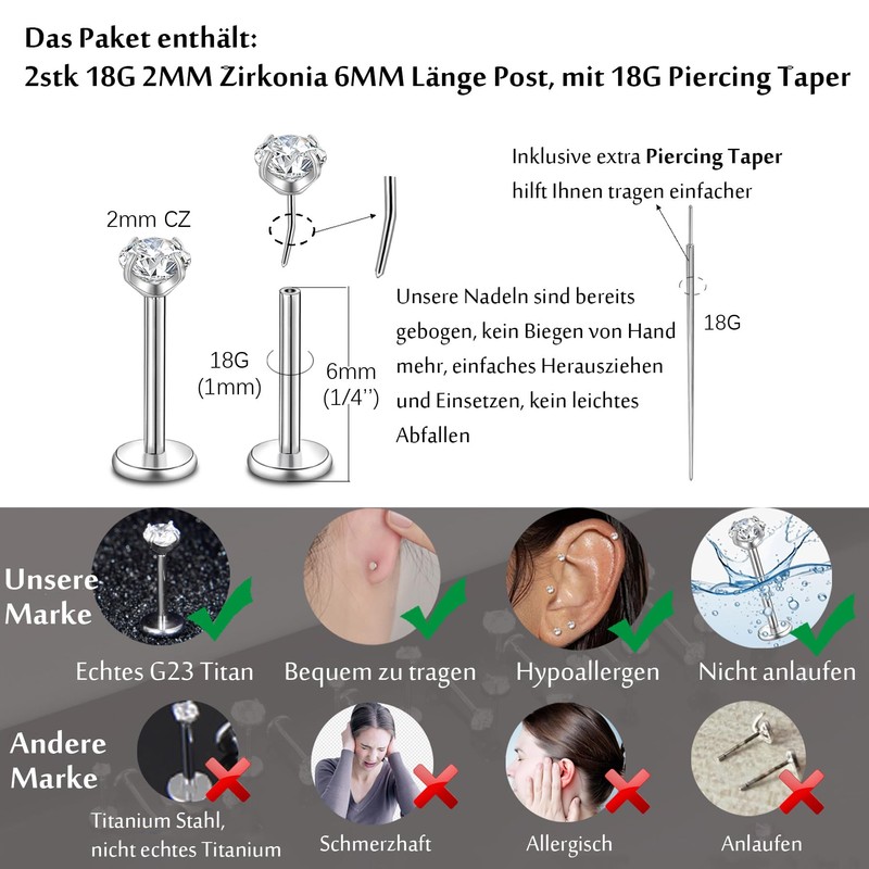 - The piercing stud package includes: 2 x titanium piercing studs, with 1 x 18G titanium piercing taper; bar gauge: 18G (1.0 mm), bar length: 6 mm, zirconia: 2 mm