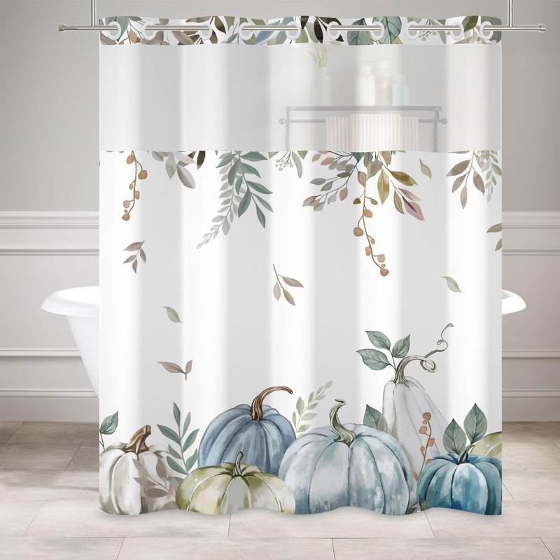 - 【Design】This beautiful shower curtain and lining set features cute pumpkins and leaves, bringing the joy of Thanksgiving to your bathroom. The double-layer design protects privacy, and the top transparent window helps the curtains dry faster.