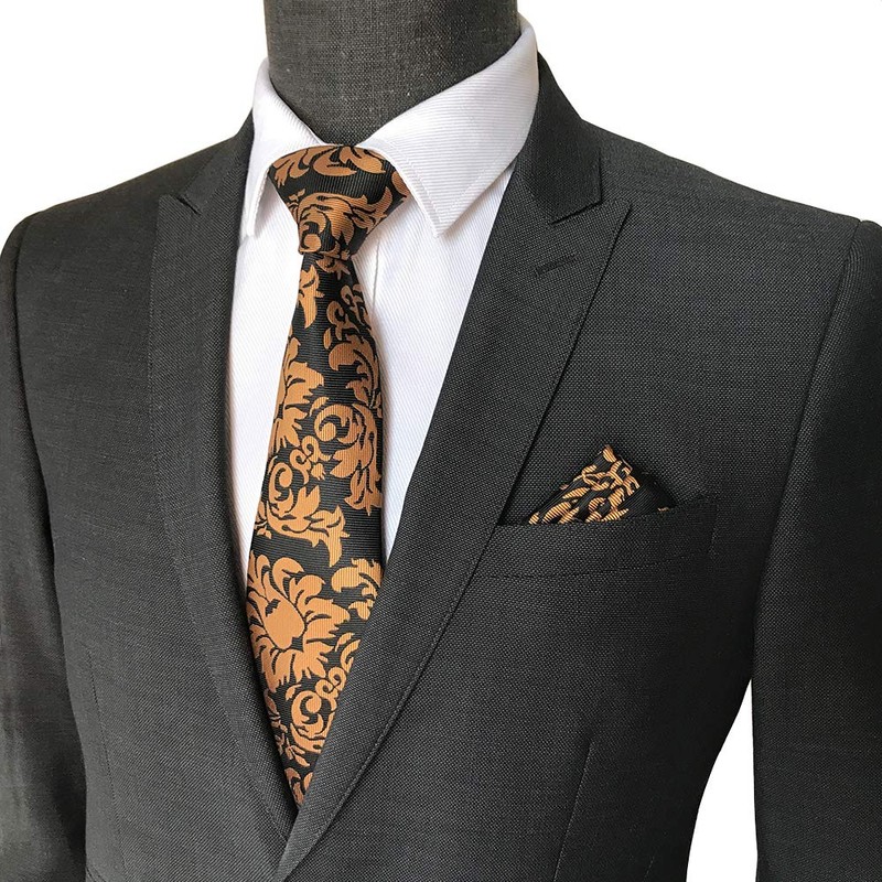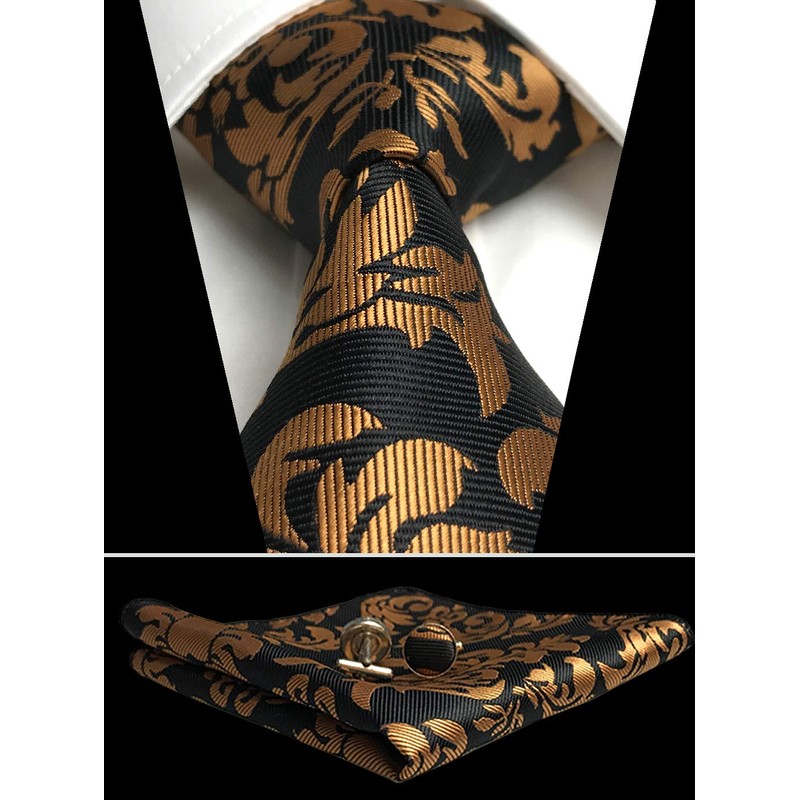 CANGRON Men Tie Gold Black Flower Necktie Pocket Square Cufflinks Tie Set LSH8ZZ