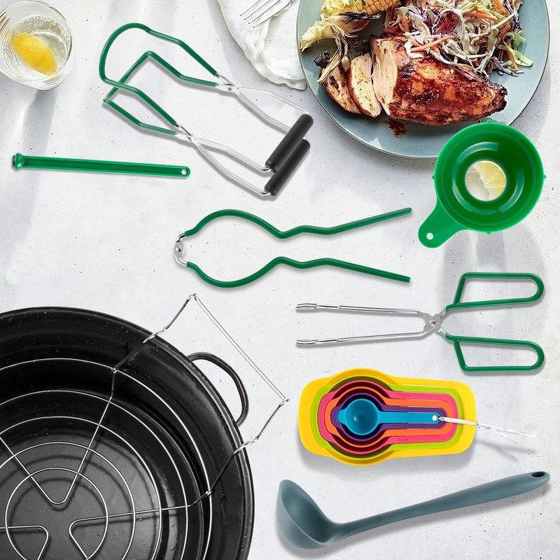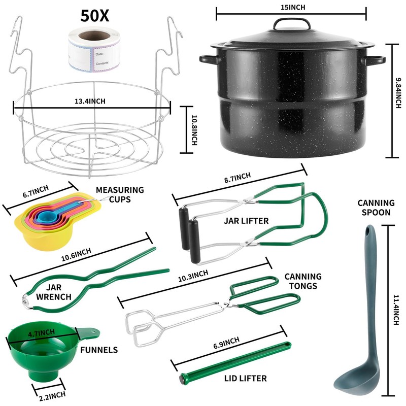 - [Full Canning kit]The full canning set includes a canning pot,a canning rack,a canning funnel,a pair of canning tongs,a jar lifter,a magnetic lid lifter(No Dishwasher),a canning wrench,a bubble popper,a canning spoon,a set of measuring cups,and a set of canning stickers.