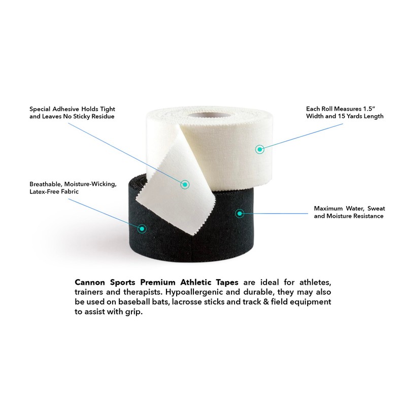 • 1.5 INCH x 45 FT PER ROLL: Cannon Sports athletic tape can help prevent injuries like sprains, strains, and overuse injuries by providing support to weak or vulnerable joints such as ankles and elbows. Designed with breathable material to minimize skin irritation and maximize comfort during extended wear.