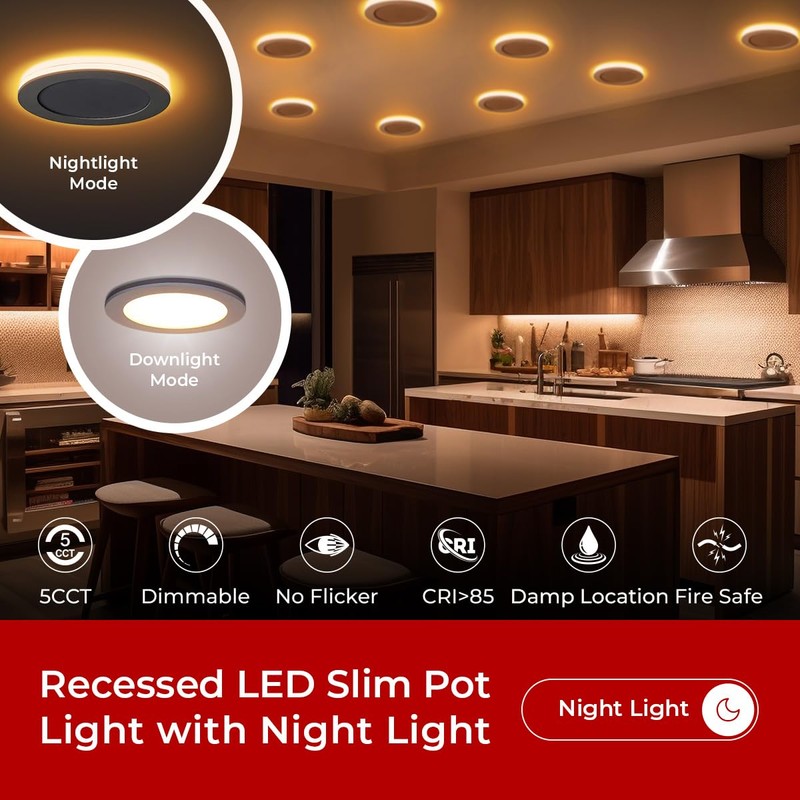 Upgrade your lighting with our 4" Recessed LED Slim Panel Pot Light with Nightlight. This two-in-one light is energy-efficient and versatile, perfect for any space.