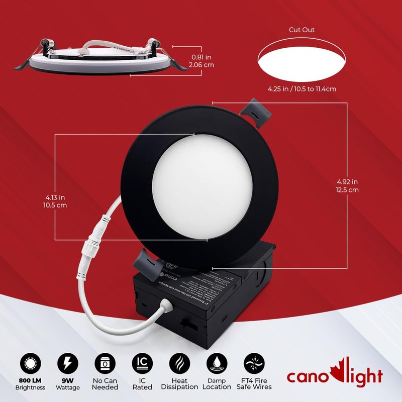 CanoLight 4" 9W Recessed LED Slim Pot Light with 2W Night Light, 2700K/3000K/3500K/4000K/5000K 5CCT Adjustable, 800LM CRI > 85, ETL Energy Star Listed, IC Rated, with Junction Box (Black, 1 Pack)