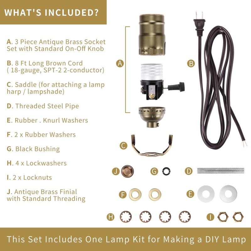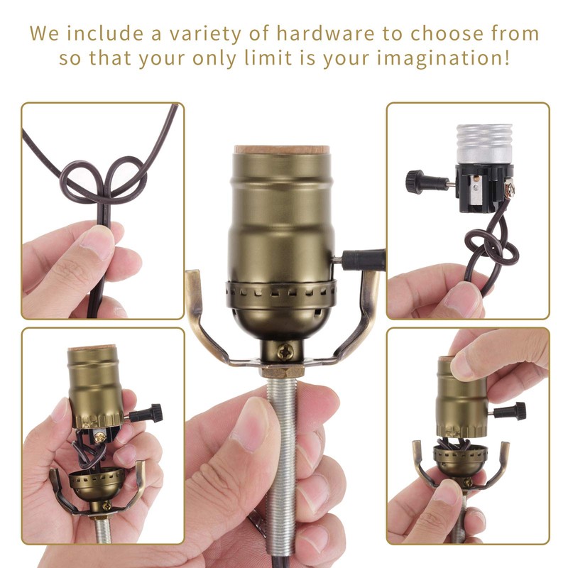 How to Assemble Your Lamp Socket: 1\. Thread The Socket Base Onto The Nipple Until It's Secure 2\. Push The Wires Up Through The Nipple and Out of The Socket End 3\. Tie an Underwriter's Knot 4\. Pull Up On The Wires to Tighten The Knot 5\. Connect The Wire Ends Around The Screws 6\. Tighten The Screws Back Up So That The Wires Are Snug 7\. Attach the Top of The Socket to The Base Until It Clicks Works great with regular bulbs and LED bulbs, perfect for repairing or rewiring old lamps. Easy install and comes with instructions, you can create a custom DIY lamp with your own lamp base in minutes or rewire an old lamp with this lamp kit. Package includes: 2 x 12 feet lamp cord 2 x 3-way matching socket 2 x Threaded steel pipe 2 x Saddle 16 x Diffrient washers 2 x Black bushing 4 x Hex nuts 2 x Antique brass finial with standard 1/4-27 threaded