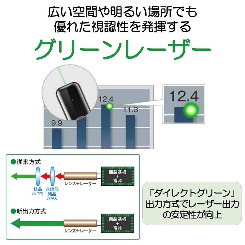 - Uses a "direct green" output systemEasy to see in big conference rooms, and comfortable to use in low temperature environments