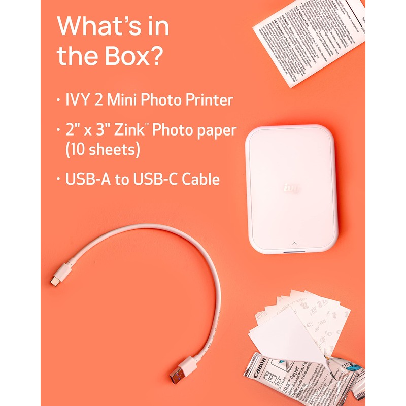 - No ink needed! The IVY 2 Mini Photo Printer uses ZINK (Zero Ink) technology, which features colorful dye-based crystals embedded inside the paper.