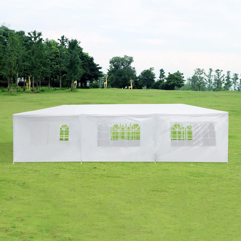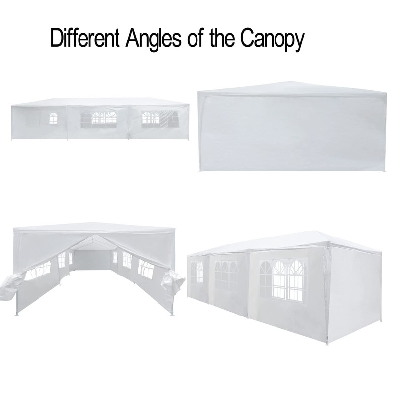 Canopy Party Tent White Shelter Gazebo Pavilion, Folding, Storage, Waterproof, 1 Mid-Zip Door, 6 Window Sidewalls, Ground Coverage Area 27 Square Meters, for Wedding Garden Barbecue Party, 10X30ft