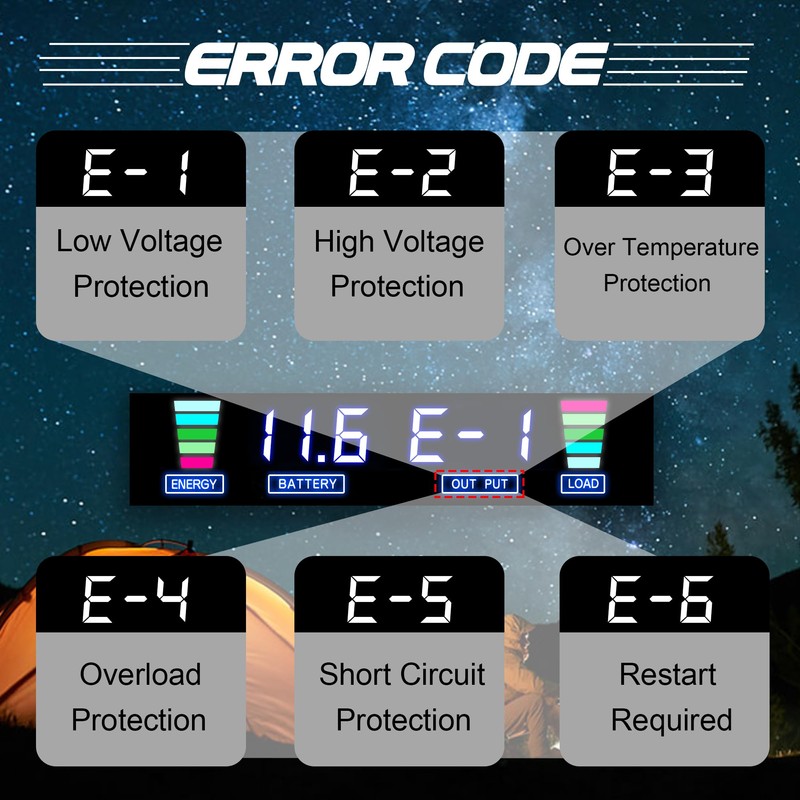 - INTELLIGENT LCD DISPLAY: In normal working state, the LCD Display will display the input/output voltage, battery capacity, load capacity and output frequency. When the inverter is in an abnormal state, the LCD Display will display the abnormal code. Such as, E-1: Low Voltage Protection, E-2: High Voltage Protection, E-3: Overtemperature Protection, E-4: Overload Protection, E-5: Short Circuit Protection, E-6: Repeated Faults Shutdown, Restart Required.