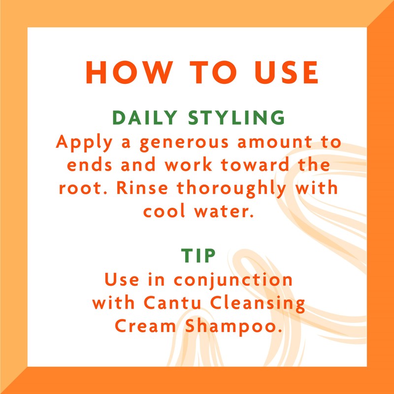 Unique sulfate-free formula moisturizes dry, brittle hair and prevents split ends and breakage. Made with pure shea butter and formulated without harsh ingredients, Cantu restores your real, authentic beauty. Embrace your curly, coily or wavy hair with Cantu. No mineral oil, sulfates, parabens, silicones, phthalates, gluten, parafin or propylene. Directions: Apply a generous amount to ends and work towards the root. Rinse thoroughly with cool water. Styling Tip: For results, use in conjunction with Cantu Sulfate-free cleansing cream shampoo.