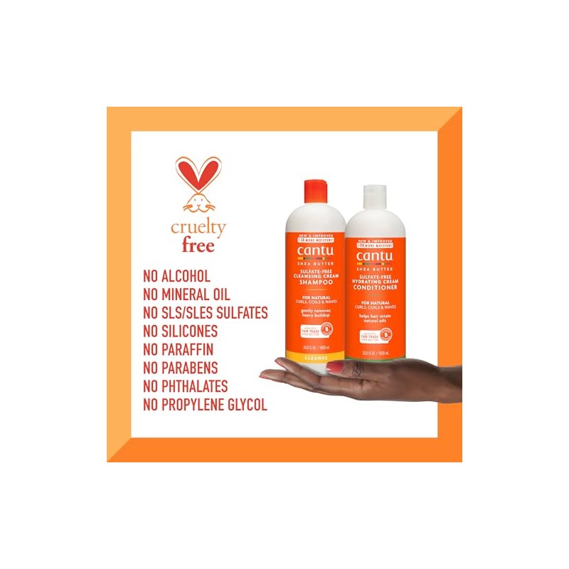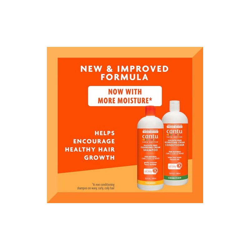 Do wash day the right way with Cantu Shea Butter for Natural Hair Sulfate-Free Cleansing Cream Shampoo and Cantu Shea Butter for Natural Hair Sulfate-Free Hydrating Cream Conditioner! Crafted with an award-winning blend of pure shea butter and essential oils, the Cleansing Cream Shampoo produces a rich lather that conditions as it cleanses, gently removing product buildup without drying out hair. For best results, apply a quarter-sized amount to wet hair and work into a lather. Massage into the scalp, and rinse. Repeat as needed. For best results, follow up with the Hydrating Cream Conditioner to help protect curls against breakage and split ends for stronger, healthier hair for best results and enjoy ultimate hydration and complete conditioning that delivers an added layer of moisture after shampooing. Enjoy ultimate cleansing, hydration and complete conditioning, formulated without the use of harsh ingredients like mineral oil, drying alcohol, sulfates, parabens, silicones, phthalates, paraffin, or propylene. Since the beginning, you've pushed us to advance skin and hair science to honor your locs, your curls, your waves, your braids, your natural. At Cantu, we support your journey with care and we celebrate all the styles you rock!