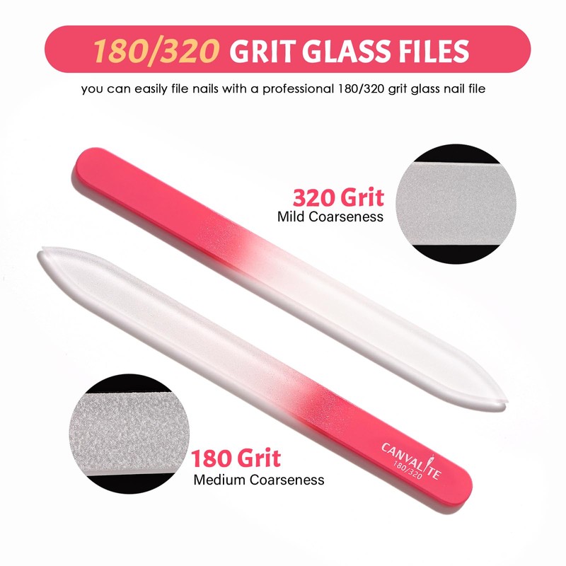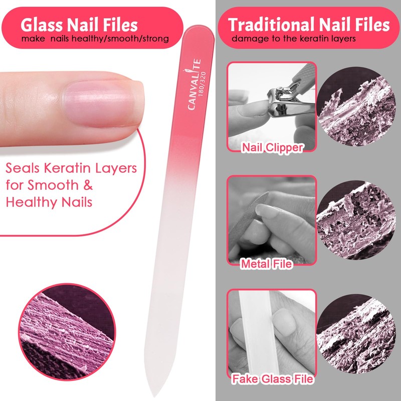 - 💘180/320 GRIT DOUBLE SIDED GLASS NAIL FILES: Glass nail files for natural nails are made of premium glass that is strong, durable and wear resistant. Nails are made up of a protective fibrous protein called keratin, which acts as a protective barrier and makes nails stronger. Using a CANVALITE crystal nail files can help you grow and keep your nails long, healthy and beautiful! Say goodbye to traditional nail files and try the crystal nail file for a luxurious nail care experience!