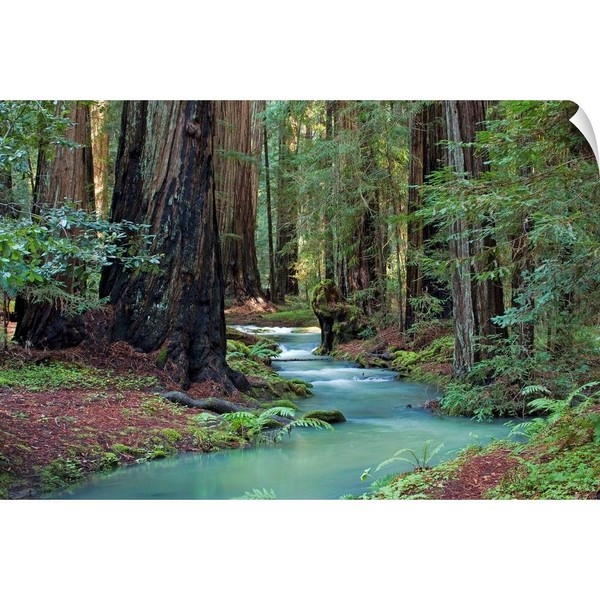 Wall decal art print entitled, "Redwood Forest II." A small stream cuts through a thick forest and is lined by immense redwood trees.