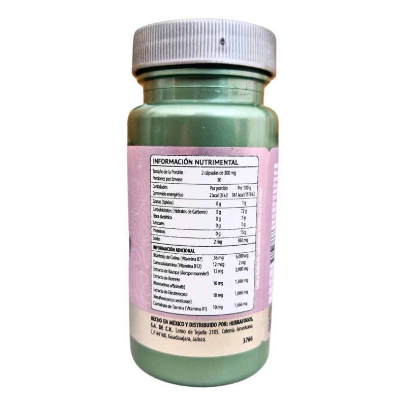 Sus ingredientes, con extracto de bacopa y romero, han demostrado su efectividad para prevenir y corregir la degeneración cognitiva y aumentar la retención, eleuterococo y vitaminas B7 y B12 para aumentar la energía cerebral.